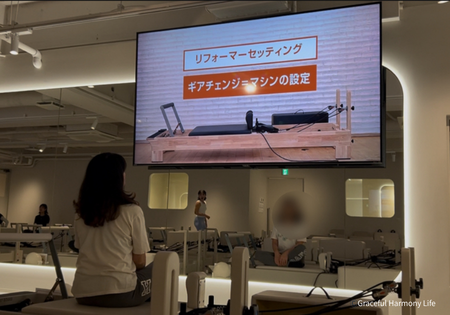 私は、まだリフォーマーのエクササイズになれていないのですが、インストラクターさんが正しい動きとフォームを修正してくださいました。