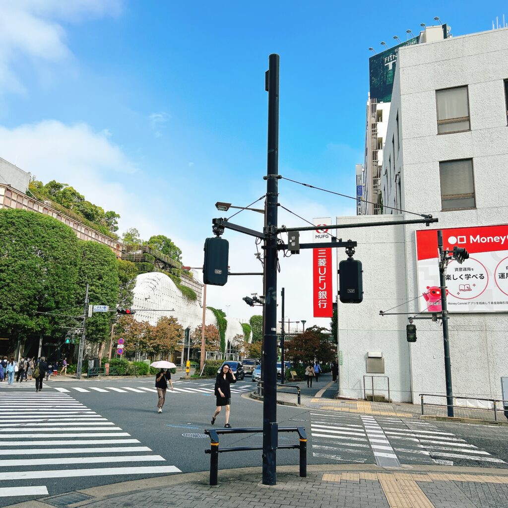 そのまままっすぐ歩くと、交差点が見えます。この交差点を三菱UFJ銀行の方へ渡って、更にまっすぐ進んでください。