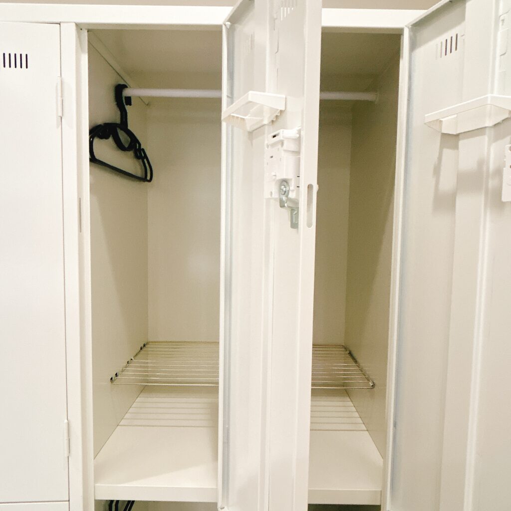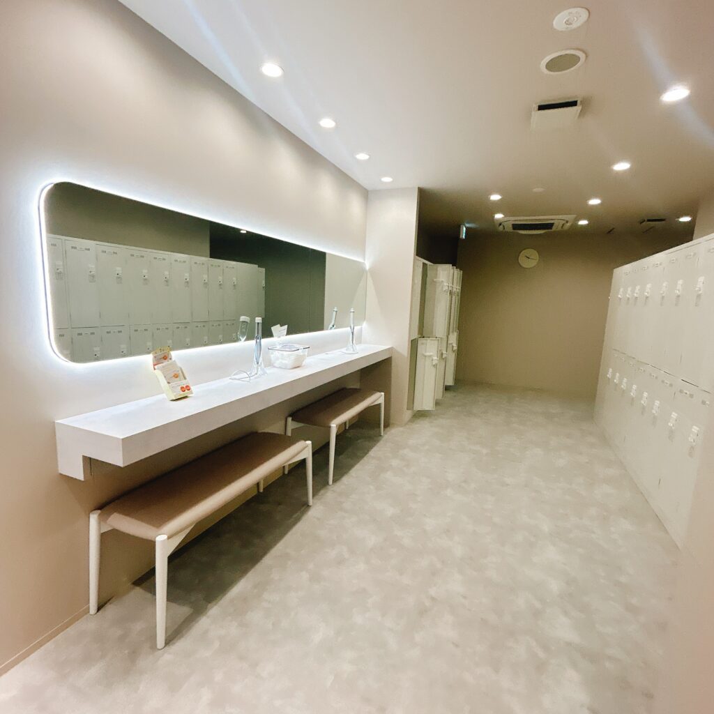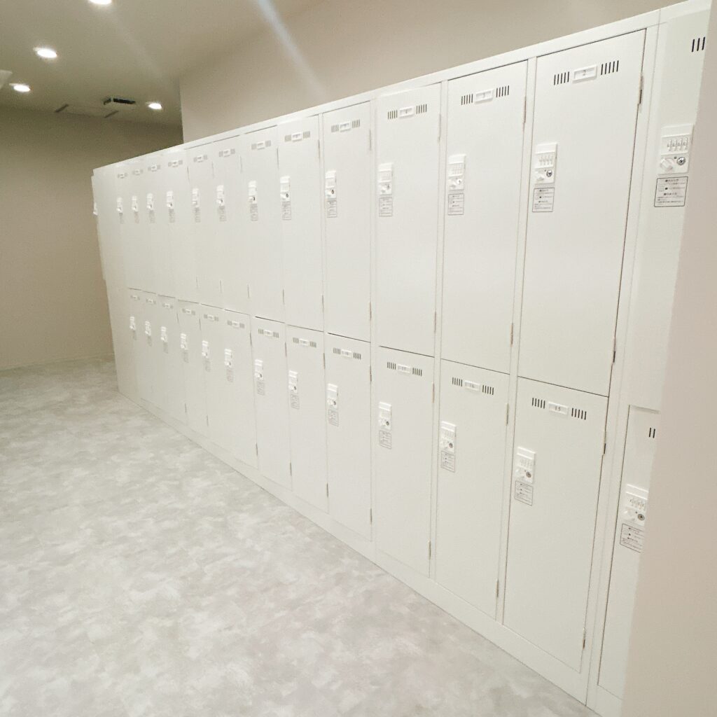Rintosull 二子玉川店には、白で統一された清潔感のあるロッカールームが用意されています。十分な広さがあり、お着替えもしやすい環境です。