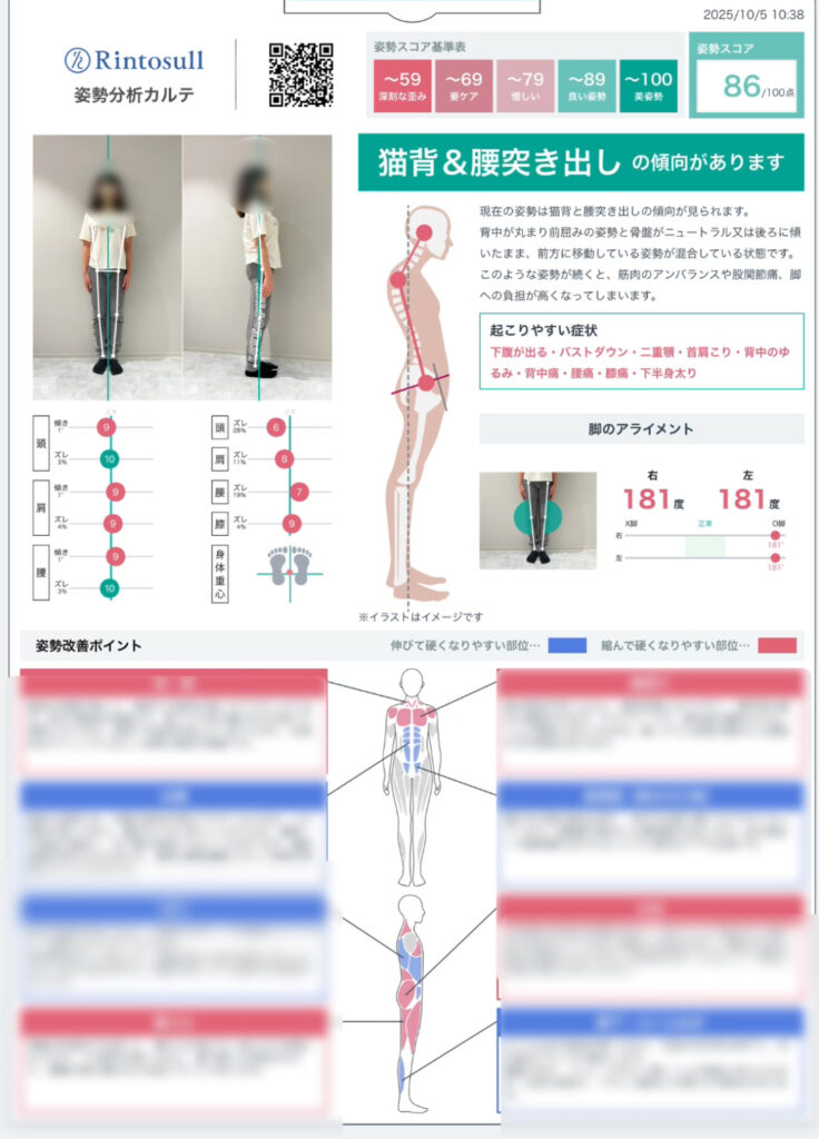結果は86点。数字だけ見ると悪くはないのかもしれませんが、この状態を放っておくと、歪みが少しずつ進行し、将来的にからだの不調につながる可能性もあるそうです。