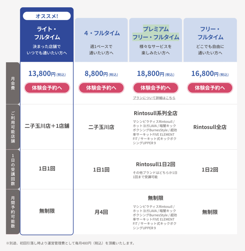 Rintosull 二子玉川店には4つのプランがありますが、やはりLAVA系列も通えるプレミアムフリー・フルタイムが圧倒的に人気だそうです。