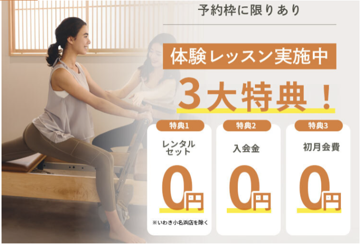 他社のピラティス・ジムに通っている方限定で、翌月以降の月会費がが3ヶ月間半額になるキャンペーンを実施しています。